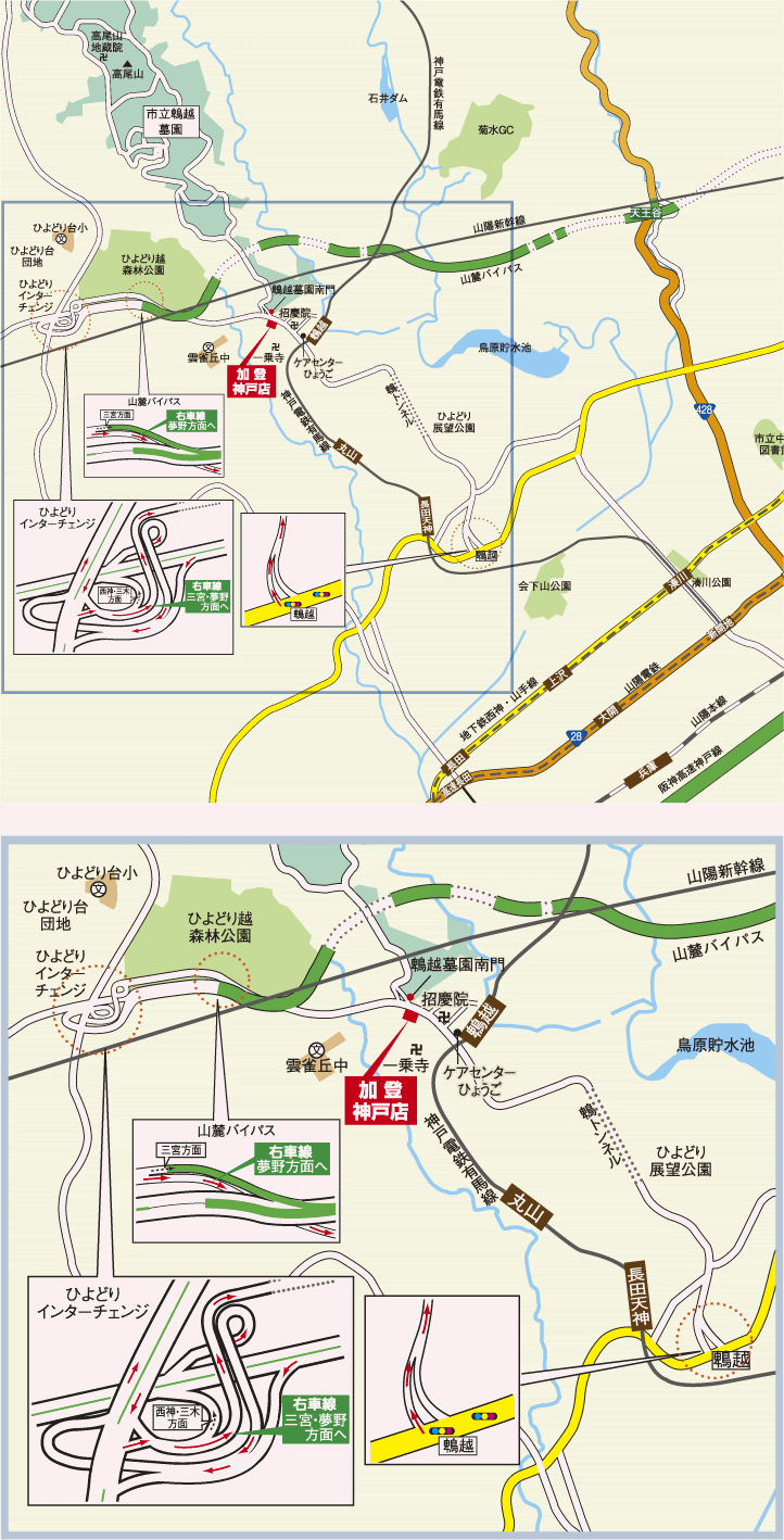 加登 神戸店は「神戸市立鵯越墓園」南門の向かいに店舗を構えており、大変便利なロケーションでご好評をいただいています。駐車場も完備しておりますので、お車でのお越しにも便利です。